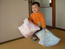 かぁちゃんがお布団をお庭に持って行ったから,おれっちは
