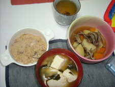 肉じゃがに豆腐とわかめと玉ねぎのお味噌汁に,シメジと鶏の炊き込みご飯゜+。:.゜ヽ(*´∀`)ノ゜.:。+゜