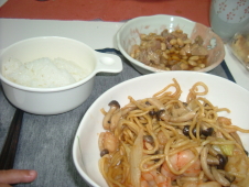 エビとシメジの焼きそばに大豆の煮物に白ご飯゜+。:.゜ヽ(*´∀`)ノ゜.:。+゜