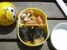 昨夜のエビご飯の残りのおにぎりにお豆さんにウィンナー☆